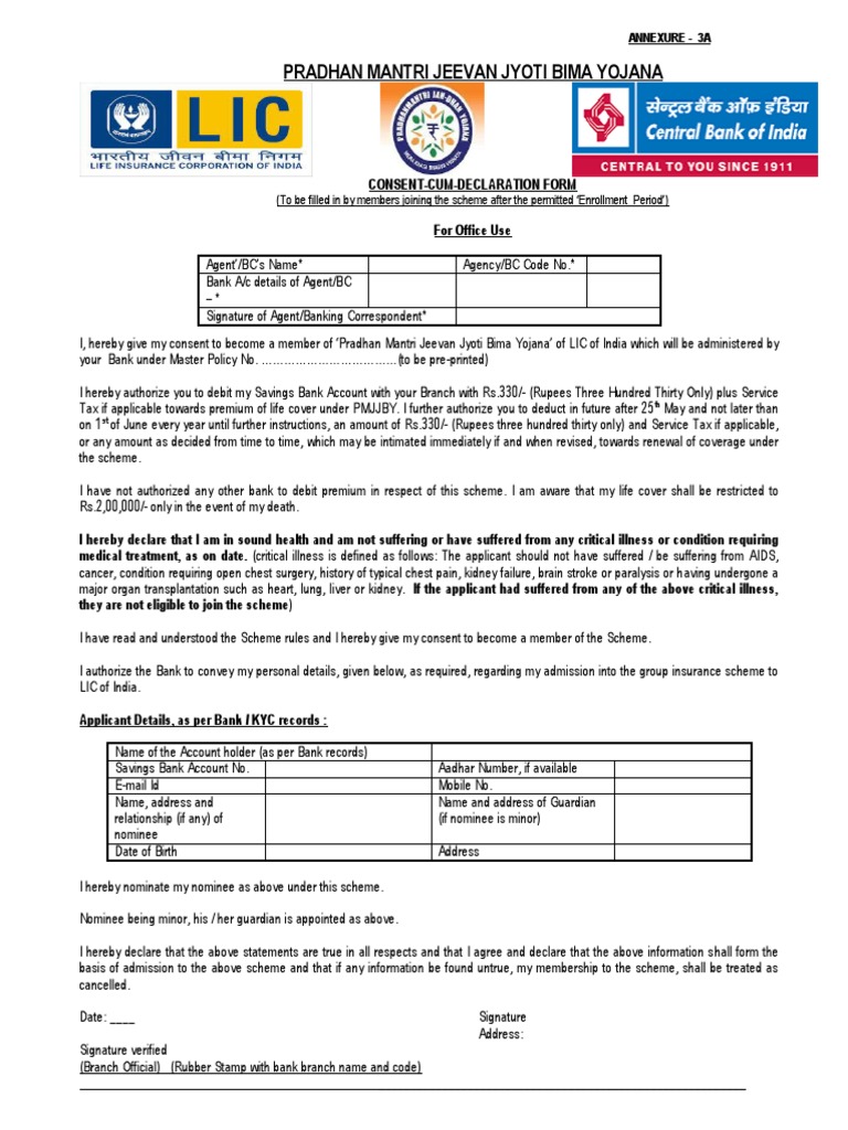 Additional details about pmjjby scheme pmjjby. • this form is to be completed by claimant & bank.